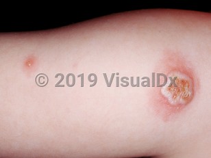 In individuals with cell-mediated immune defects, the implantation can be serious and life-threatening and lead to progressive vaccinia. Although no age group is spared, children are most susceptible to more extensive inoculations because of their propensity to scratch the vaccination site. Adults frequently implant virus on the face as a result of inadvertent contamination of the hands or via fomites.