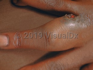Blistering distal dactylitis is an acute superficial infection of the palmar fat pad of the finger, usually caused by Group A streptococci (Streptococcus pyogenes) or Staphylococcus aureus. Occasionally, lesions may occur on the proximal digit or palmar surface. School-aged children are most commonly affected, but it may occur in any age group. There are a few reports of blistering distal dactylitis occurring in immunosuppressed or immunocompromised children and adults (eg, HIV, diabetes mellitus, and prednisone use). In some cases, inoculation from nasal bacterial colonization / flora has been suspected (eg, from nose picking).
