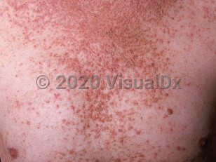 Hundreds of confluent, reddish-brown, scaly papules forming plaques on the upper chest.