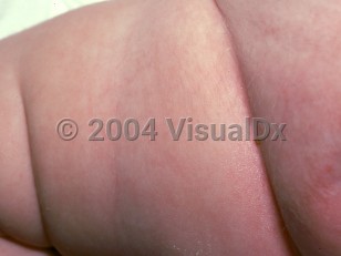 Clinical image of Focal dermal hypoplasia - imageId=2240988. Click to open in gallery.  caption: 'White atrophic papules and plaques on the buttock and posterior thigh.'