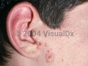 Clinical image of Gladiatorum herpes simplex virus - imageId=1919336. Click to open in gallery.  caption: 'A cluster of vesicles on the lateral cheek.'