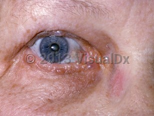 Clinical image of Apocrine hidrocystoma - imageId=194172. Click to open in gallery.  caption: 'Numerous small, translucent cystic papules on the upper and lower eyelid margins.'