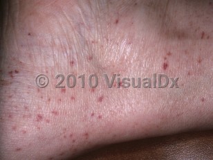The petechiae and purpura are frequently exacerbated by prolonged periods of standing, wearing tight clothing, alcohol intake, and exercise. The eruption is usually asymptomatic, yet some patients may report burning, stinging, pruritus, or lower extremity swelling. The pathogenesis of purpura is thought to be due to immune complex deposition in the blood vessels of the lower extremities. Truncal involvement can also be seen.
