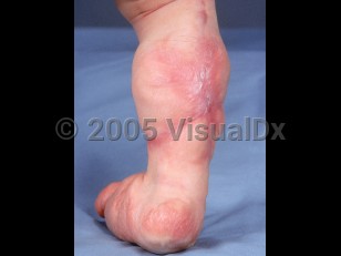 Clinical image of Lipoblastomatosis - imageId=2453048. Click to open in gallery.  caption: 'A diffusely enlarged leg and foot with overlying surgical scars and reddish plaques on the foot.'
