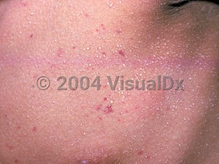 Miliaria crystallina, also referred to as sudamina, is due to occlusion of the eccrine ducts at the superficial epidermis or stratum corneum. It may occur at any age but is common in neonates and infants, probably secondary to the immaturity and weakness of the duct structure. Clinically, it presents as largely asymptomatic 1- to 2-mm fragile vesicles. It has predilection for the face, neck, upper torso, and occluded areas. Fever, exposure to warm and humid environmental conditions, and occlusion (excessive clothing or swaddling) are predisposing factors.