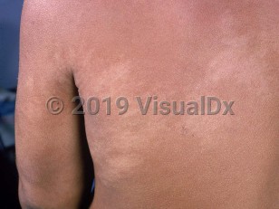 Clinical image of Nevus depigmentosus - imageId=807042. Click to open in gallery.  caption: 'Subtle, large, hypopigmented patches with feathery borders, on the back and arm.'