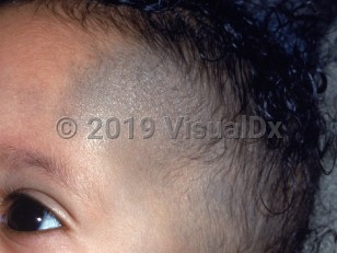The visible pigment arises from an increased number of dermal dendritic melanocytes, and the blue and gray color seen is secondary to the Tyndall effect. Nevus of Ota occurs with greater frequency in patients with Asian or African ancestry. The mutations driving nevi of Ota may result in clinical manifestations as soon as early infancy. Darkening and extension may occur with ultraviolet (UV) radiation exposure and with hormonal influences around puberty.