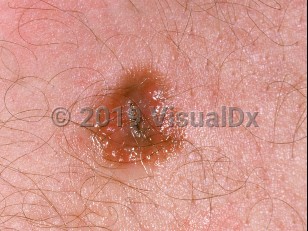 Spitz nevi (also known as spindle and epithelial cell nevi or benign juvenile melanoma) are benign melanocytic nevi of early childhood. These lesions are often red, pink, or, less commonly, dark brown, and appear as well-defined, smooth, firm, flat- or dome-shaped nodules and papules often less than 6 mm in diameter.