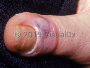 Acute paronychia frequently arises from trauma to one of the nail folds, resulting in compromise of the physiologic barrier to entry of microorganisms. Inflammation may proceed to bacterial infection, resulting in pus. In some cases, the abscess tracks under the nail plate, and if not treated quickly, it can result in permanent damage to the nail matrix.