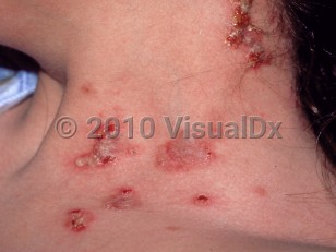 Clinical image of Pemphigus vegetans - imageId=223843. Click to open in gallery.  caption: 'Flaccid vesicles, some cloudy, with surrounding erosions and crusting, on the lateral neck.'