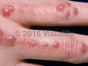 In the skin, MRH appears as papules and/or nodules that most frequently occur on the acral areas of the body, especially the head, hands, and juxta-articular regions of the extremities. Mucous membrane involvement occurs in up to half of patients. The typical mucosal eruption is characterized by multiple erythematous papules and nodules that affect the oral and nasopharyngeal mucosa. Mucocutaneous disease typically lasts 5-10 years with subsequent regression.
