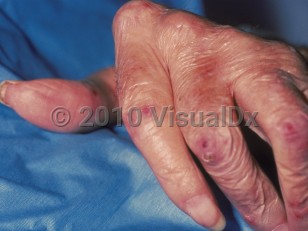 Clinical image of Rheumatoid vasculitis - imageId=44401. Click to open in gallery.  caption: 'Purpuric papules and crusting with surrounding pink erythema on the thumb and fingers.'