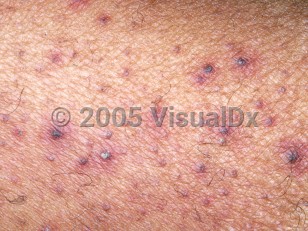 Clinical image of Scurvy - imageId=2760850. Click to open in gallery.  caption: 'A close-up of scattered perifollicular purpura and "corkscrew" hairs.'
