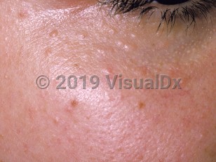 Syringomas are benign adnexal tumors derived from intraepidermal luminal cells of eccrine sweat ducts. They present as small, dome-shaped papules, often in a periorbital distribution. They may, however, occur at any site on the body. They are seen more frequently in women and in those with Down syndrome. Although usually sporadic, familial cases have been reported and inherited in an autosomal dominant manner. Treatment of these lesions is cosmetic.