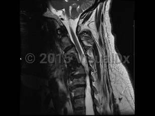 Symptoms depend on the location of the lesion; most occur in the cervical region, between C2 and T9. In some cases, patients are asymptomatic, and syringomyelia is an incidental finding on imaging. Cervical syringomyelia typically manifests as early impairment of temperature and pain sensation in a cape-like distribution over the back and arms, and weakness that is greater in the bilateral upper extremities compared with the bilateral lower extremities. There may also be chronic pain. Neurologic examination may be notable for loss of reflexes, light touch, vibration, and joint position sense; weakness and atrophy of the hands; and lower extremity spasticity and hyperreflexia. Bladder, bowel, and erectile dysfunction can occur as late manifestations.