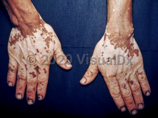 Clinical image of Pinta - imageId=2057099. Click to open in gallery.  caption: 'Depigmented macules and patches on the dorsal hands and fingers.'