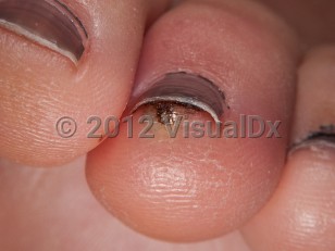 Clinical image of Tungiasis - imageId=6560910. Click to open in gallery.  caption: 'A cloudy vesicle with a central blackish crust on the distal toe.'
