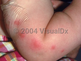 Papular urticaria is a chronic or recurrent pruritic eruption believed to be an allergic (hypersensitivity) reaction to insect bites. It is very common in children, especially in the spring and summer in temperate climates and year round where the weather is warm. It can occur anywhere on the body but tends to occur on the exposed extensor surfaces of the extremities. A history of exposure to fleas, mosquitoes, chiggers, mites, bedbugs, or other small insects should be searched for.