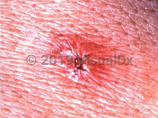 A close-up of an erythematous papule with a central hemorrhagic crust.