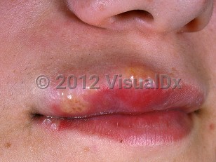 HSV can also disseminate, occurring on skin areas distant from the lips. Two general groups of patients are at risk to develop disseminated HSV: patients with underlying skin disease and immunocompromised patients.