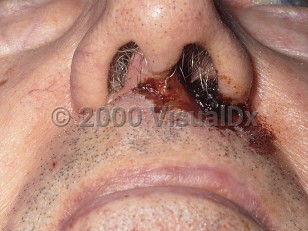 Trigeminal trophic syndrome (TTS) is a complication of damage to the trigeminal sensory nerve or sensory nuclei resulting in self-induced excoriations of the skin on the central face. Typically, iatrogenic following therapeutic ablation of the trigeminal nerve, facial dysesthesia or hyperesthesia develops, classically involving the nasal ala. This can also occur on the upper lip, paranasal area, scalp, medial forehead, or ear. Patients may describe pain, itch, picking, or scratching sensations in the region and, as a result, manipulate or excoriate their skin.