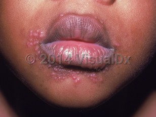 Numerous substantive pink papules around the mouth.