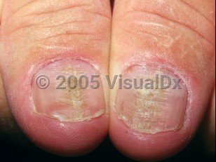 Clinical image of Onychotillomania - imageId=2704562. Click to open in gallery.  caption: 'A central longitudinal groove with a few parallel transverse grooves and overlying hyperkeratosis on each thumbnail. Note also the enlarged lunulae.'