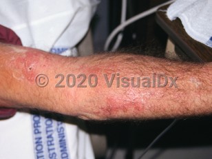 Clinical image of Protothecosis - imageId=3529643. Click to open in gallery.  caption: 'Crusted, erythematous papules and plaques on the arm.'