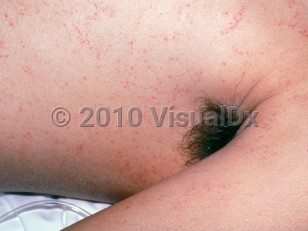 Clinical image of Fat emboli - imageId=1731889. Click to open in gallery.  caption: 'Myriads of pink and purpuric macules and papules on the trunk and arm, after a motor vehicle accident.'