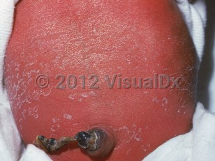 Vernix is a white cheesy substance that consists of sebaceous glands and desquamated cells from the amnion. This substance forms a thick coating around the neonate in utero by 36-38 weeks. The purpose of vernix is to protect and hydrate neonatal skin, and some studies have demonstrated antibacterial qualities to this substance. In postmaturity syndrome, the newborn is almost devoid of vernix. The loss of this leads to skin that is dry and scaling with superficial cracking and desquamation of the palms and soles.