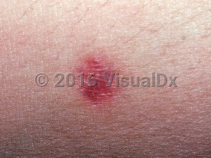 Clinical image of Multinucleate cell angiohistiocytoma - imageId=2377593. Click to open in gallery.  caption: 'A close-up of a reddish and violaceous papule.'