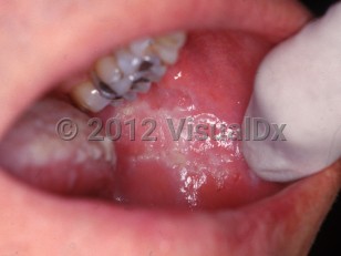 Clinical image of Chronic cheek chewing - imageId=2556547. Click to open in gallery.  caption: 'A ragged plaque on the buccal mucosa.'