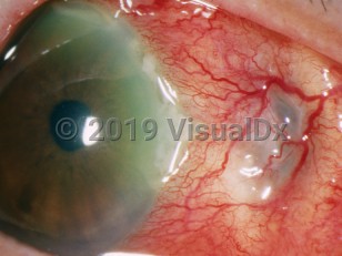 Necrotizing scleritis typically causes severe injection and pain in a patch of the sclera. With progressive disease, the sclera will necrose, leaving only a white patch of thin sclera surrounded by red, inflamed blood vessels. As the sclera thins, the blue color of the underlying uveal blood vessels becomes visible (blue sclera), and, at times, the intraocular pressure can cause an out-pouching of an area of the sclera.
