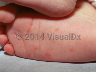 Symptoms and signs typically develop approximately 3 weeks after the primary infestation. The most common clinical manifestation of scabies in infants is the development of pustules, vesicles, and crusting. The palms and soles, fingers, face, and scalp are most heavily involved. Secondary impetigo and eczematization are common. The primary symptom of infestation is pruritus, and in young infants who have not developed a coordinated itch response, this may manifest as rubbing the head against a caregiver, irritability, insomnia, poor feeding, and failure to thrive.