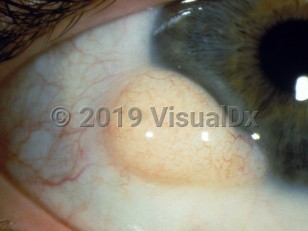 Dermoids are an overgrowth of normal, non-cancerous tissue in choristomatous tissue (tissue in an abnormal location). Epibulbar dermoid cysts are either limbal, at the junction of the cornea and sclera, or more posterior, at the junction of the bulbar and lid conjunctiva. Limbal epibulbar dermoid cysts are most often found at the inferior temporal limbus, while the posterior epibulbar dermoid cysts are often hidden under the outer upper eyelid laterally. Worldwide incidence is 1–3 per 10,000. These lesions may not only be cosmetically disfiguring but affect vision depending on how they affect the cornea and, hence, refractive status. Therefore, amblyopia is a serious concern with the limbal form. Foreign body sensation and an enlarging mass may also be presenting symptoms.