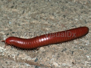 Skin exposure to millipede secretions can cause a burning sensation, inflammation, and a tanning discoloration of the skin that may subsequently blister and exfoliate, resulting in pigmentation and scarring. Ocular exposure can cause immediate pain and tearing and may lead to chemosis, blepharospasm, periorbital edema, conjunctivitis, keratitis, and corneal ulceration. Blindness is reported in the literature but is not well substantiated. No human fatalities have been associated with millipede secretions.