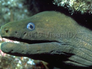 Moray eels are bottom dwellers that inhabit tropical and subtropical coral reefs throughout the world where they are commonly found in holes and crevices. They are feared by many because of their snake-like appearance, bead-like eyes, and open mouths that seem ready to bite. In reality, moray eels rarely attack without provocation, have poor eyesight, and their mouths are open to allow water to pass through their gills to extract oxygen. Moray eels grow up to 3.5 m (11.5 ft) in length and 35 cm (1 ft) in diameter, and they can weigh up to 34 kg (75 lbs). They have vice-like, muscular jaws that can clamp down with great power and tear flesh from its prey.
