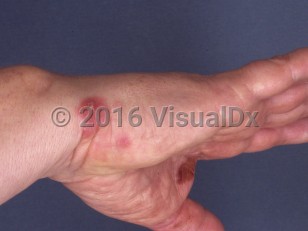 Contact sponge dermatitis is an allergic reaction that often begins 5 minutes to 2 hours after contact with a sponge and is typically seen on the hand. A stinging, itching, or burning sensation is felt and is usually aggravated by wetting or rubbing the area. Edema, warmth, and joint stiffness may be the only signs or a red urticarial rash may develop. Without treatment, symptoms last for 3-7 days. Typically, there are no systemic symptoms unless a large area of skin came into contact with a sponge. Fever, chills, nausea, malaise, muscle cramps, and dizziness have been reported. Erythema multiforme and an anaphylactoid reaction may develop 1-2 weeks after a severe exposure.