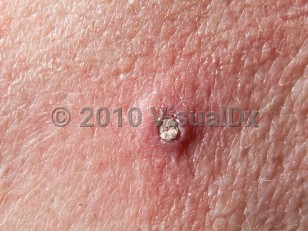 A close-up of a pink papule with keratotic material clogging a central pore.