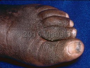 - The ankle or interphalangeal joints become fixed and difficult to flex or dorsiflex. This may be accompanied by adhesion and fusion of the toe web spaces, making the toes appear short or indistinct. Sensation is preserved. X-rays show tuft resorption and loss of bone density.
