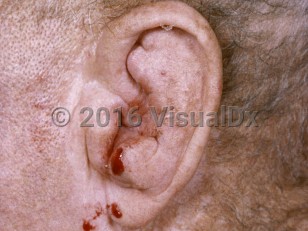Clinical image of Perichondritis - imageId=7407461. Click to open in gallery.  caption: 'Marked swelling and deformity of the cartilage of the ear.'