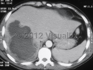 Laboratory evaluation reveals leukocytosis, elevated transaminases, and elevated alkaline phosphatase. The abscess can be visualized by computed tomography or ultrasound. Usually only one lesion is seen. Most of the time, the lesion is located in the right lobe of the liver.