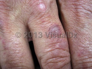 Microvenular hemangioma, also known as microcapillary angioma or microcapillary hemangioma, is a rare, benign, acquired vascular proliferation. It typically presents as a solitary, asymptomatic, purple to red papule, plaque, or nodule on an extremity or the trunk. Young adults are most commonly affected, and there is a slight female predominance. Occasionally, there may be pruritus, tenderness, or multiple lesions.