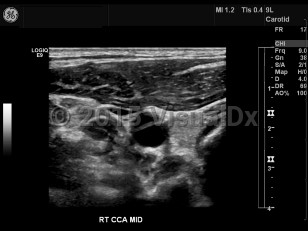 Imaging Studies image of Carotid artery dissection - imageId=7872495. Click to open in gallery.  caption: '<span>Common carotid artery dissection.   Grayscale ultrasound image demonstrates a luminal flap within the common  carotid artery. Dissection was confirmed by CT angiogram (not shown).</span>'